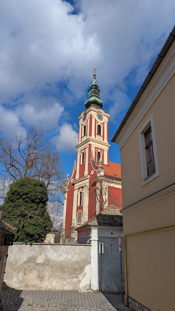 One of our tour guides expressed surprise that we were spending the entire trip in Budapest because apparently that isn’t common. However, our travel agent had already recommended a popular day trip to the artists’ town of Szentendre. For this day trip, we met our tour guide, Nikki, at a designated meeting spot (our first time leaving the Pest side for the Buda side), and she took care of train tickets for the approximately 45 minute ride. She even told us which side of the train to sit on to get a view of the Danube during the ride. Once we arrived in Szentendre, she gave us some light history of the town and gave us suggestions of places to visit there. The tour included a lángos lunch, then we had some free time to explore on our own before meeting her again for the train ride back to Budapest.