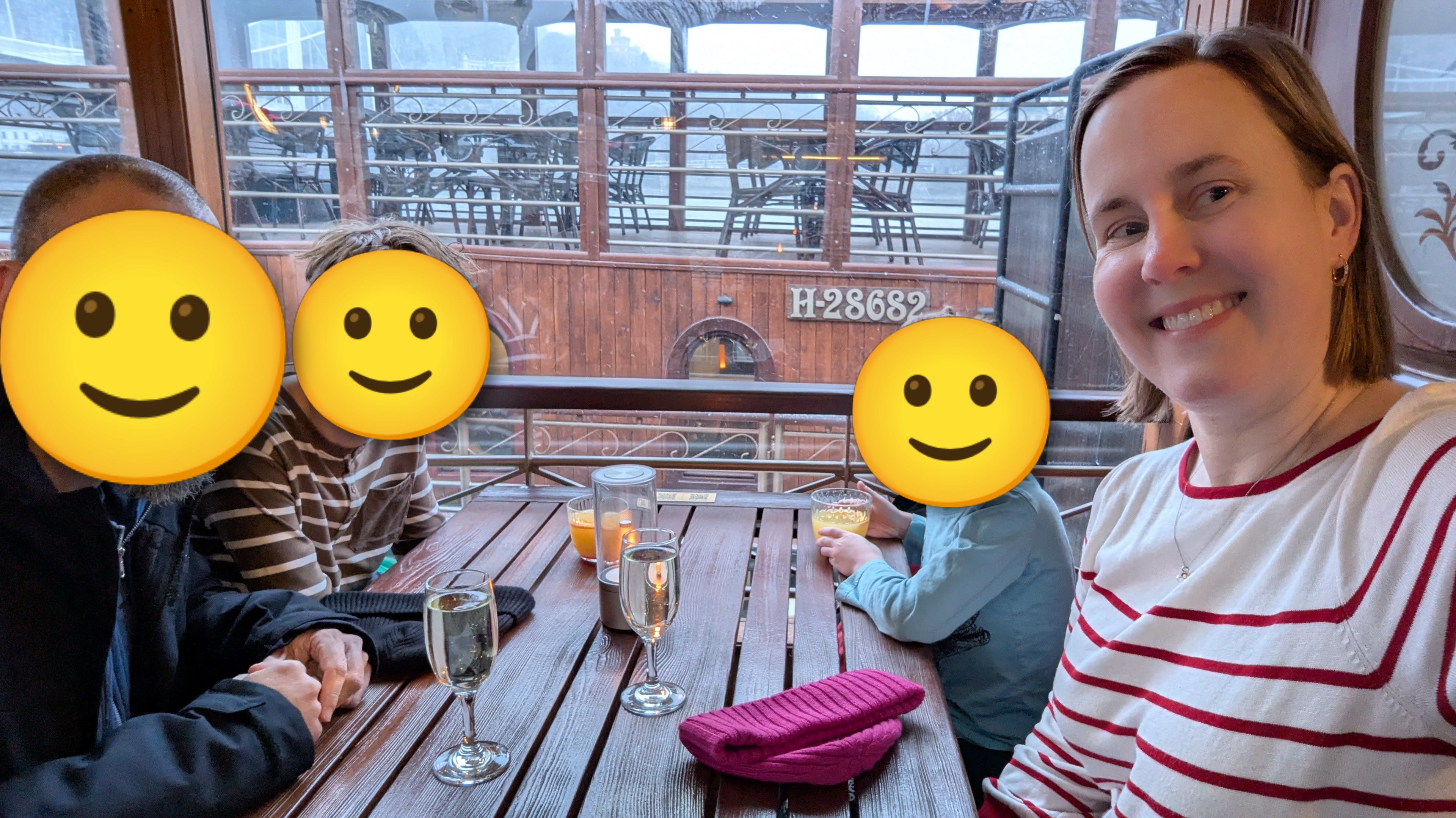 After the tour, we relaxed in our hotel room before heading to our boat cruise. An evening boat cruise is a popular tourist activity in Budapest because cruising the Danube with the buildings lit up is beautiful. Ours was booked for 4:00pm because we wanted to be able to have dinner at our usual time. As it approached, I slightly regretted that we hadn’t chosen a different time, but that changed when I realized it was snowing. The buildings weren’t lighting up until the end of our cruise, but it was snowing the entire time. Guests were treated to a welcome drink upon boarding and could order more during the excursion. L’s assessment was “Wonderful drinks and delicious snacks!”