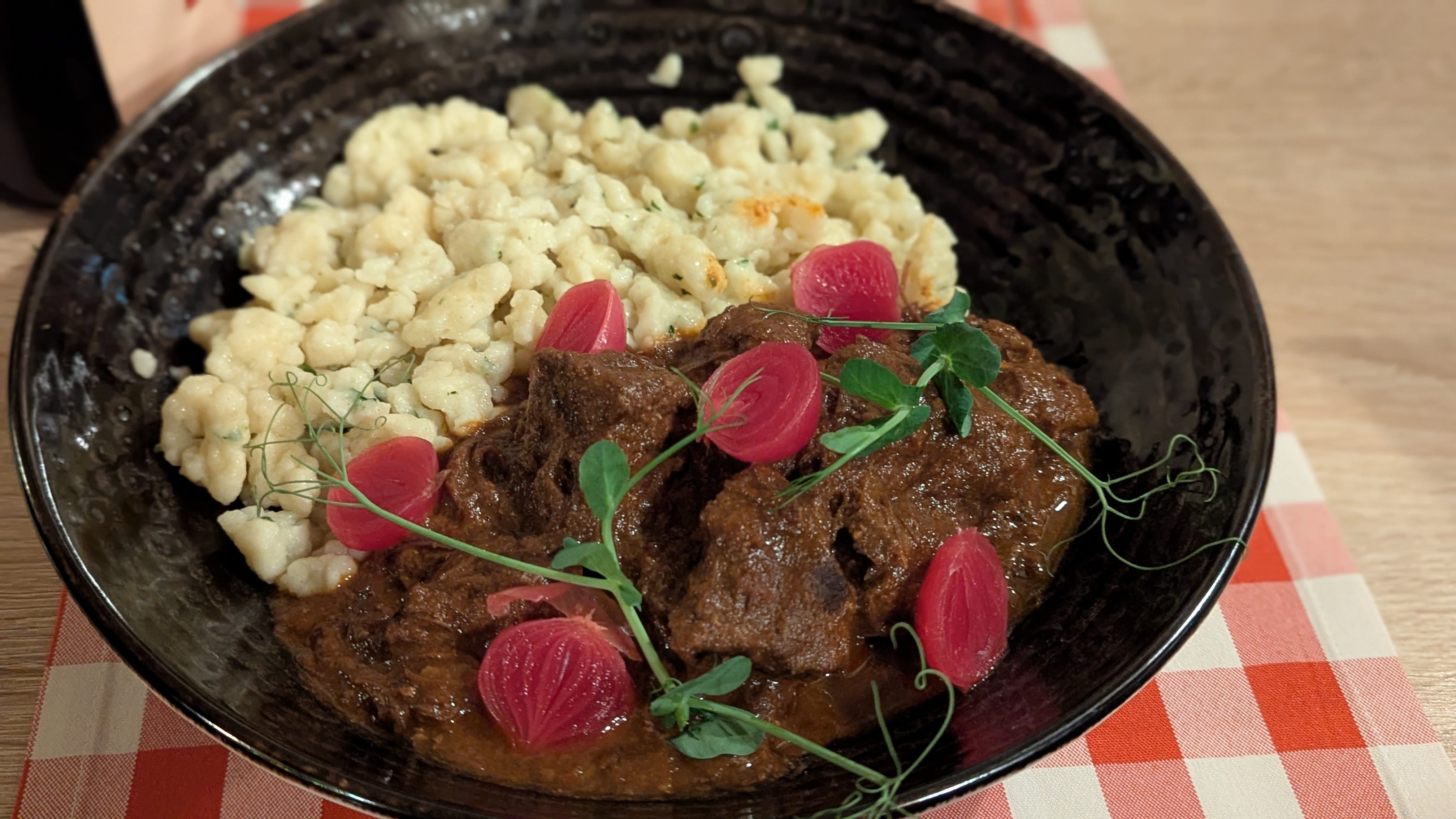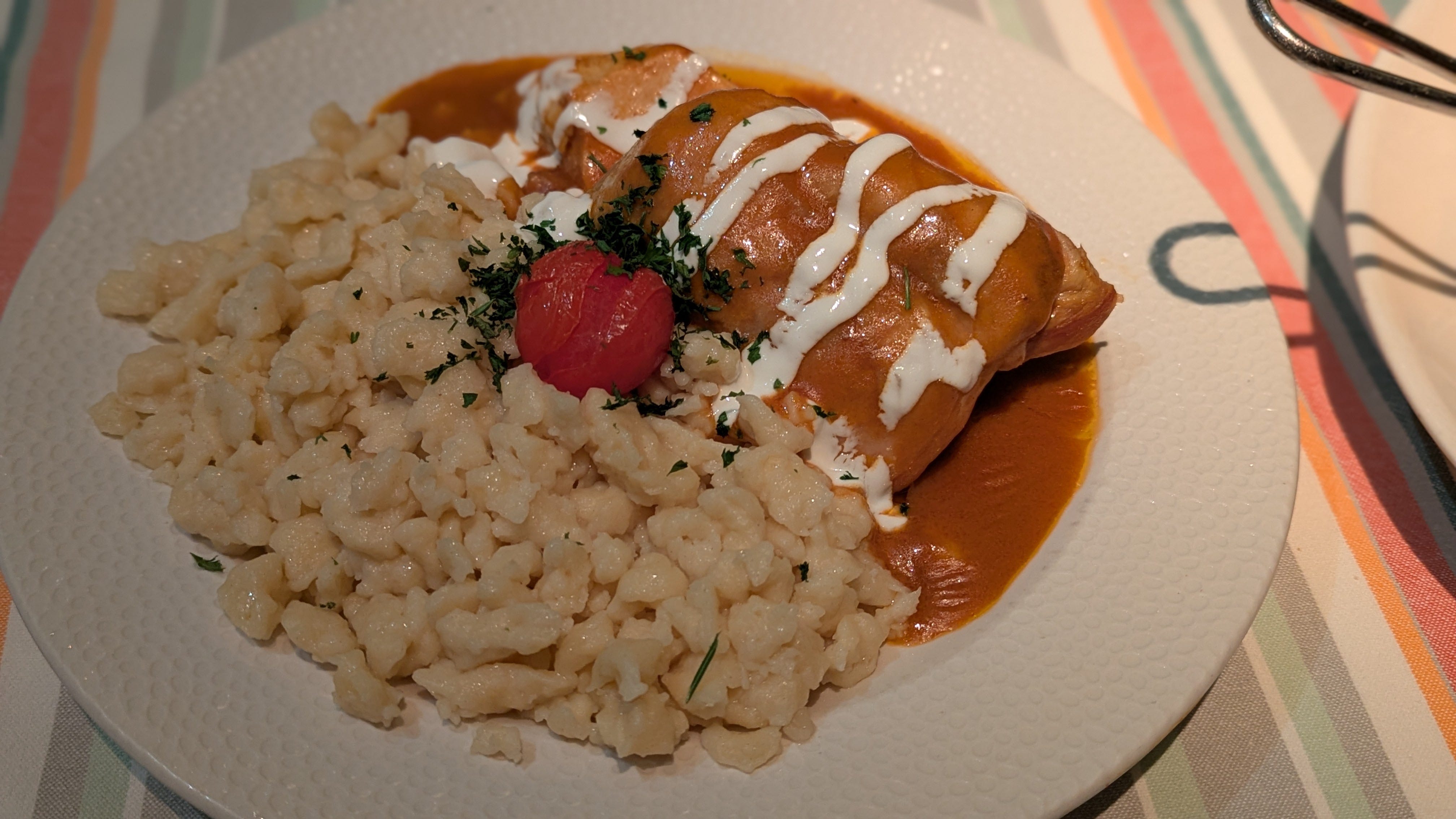 We had booked a dinner reservation at Menza Étterem és Kávéház. They had extensive cocktail options and wines by the glass and bottle; the menu noted local options, which I always appreciate because I like trying the local beverages when I travel. There was not a separate kids’ menu, but both of our kids (one who’s culinarily adventurous and one who’s not) were thrilled with the fish and chips. I was thrilled with the chicken paprikash; I had been determined to try this Hungarian dish during our trip.