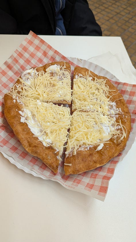 New food: Chimney cake (me, L), Lángos (S), Goulash (C)