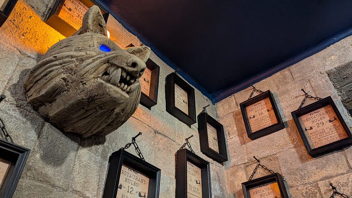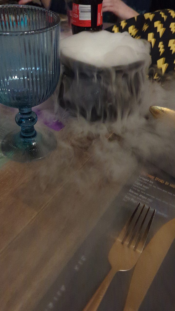 Dinner was another recommendation from a friend, and it proved our kids’ favorite restaurant of the trip. The MAGIC had cauldrons, spells, and other wizarding decor reminiscent of a very popular franchise.