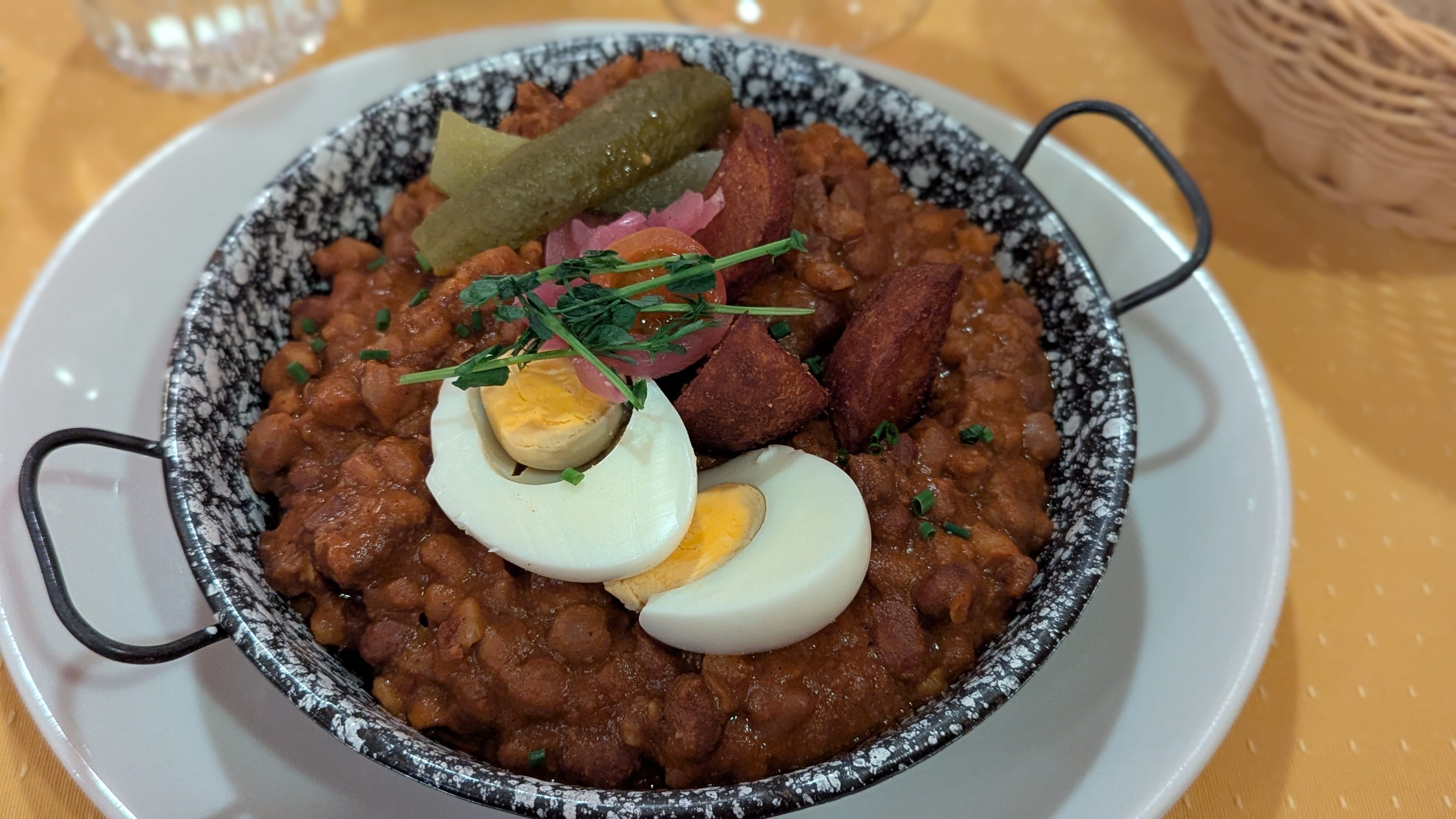 On a rainy evening, Spinoza Café & Restaurant was an excellent location to have dinner. The staff were so kind and friendly, and the food was also wonderful. It was my first time trying matza ball soup, and it was flavorful and comforting. Also comforting was my cholent, an Israeli dish. I wished I’d been able to finish it. S (10) had the salmon and said it was “very good.” There was a designated kids menu, but the chicken tenders were a little too spicy for L. Regardless, we were all content with our experience.