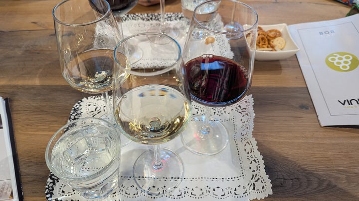After our non-first class flight, we enjoyed the welcome treats in our hotel room. Then we headed out to explore Budapest. As usual, we wanted to visit a local wine shop and choose something to enjoy in our room after the kids went to bed. VINUGO offered wine flights. The staff helped us choose based on our preferences and directed us toward options made with typical Hungarian grapes. We chose two bottles to purchase.